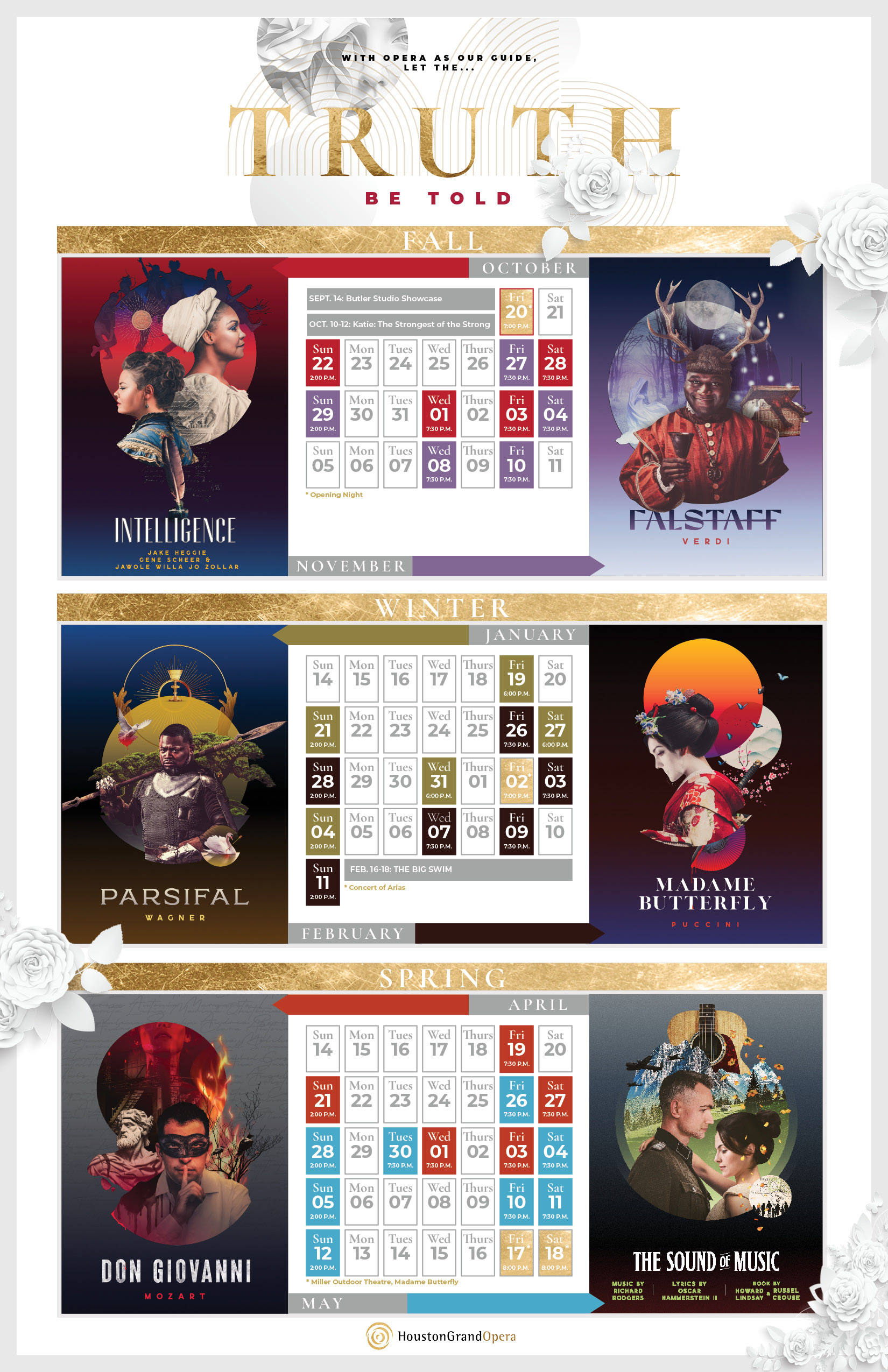 I created a calendar design that shows the artwork and upcoming season show dates. Depicted by layout design and color theory. This project was a favorite of mine going into the new season.